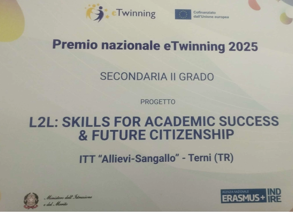 Il progetto L2L: Skills for Academic Success & Future Citizenship ha ottenuto il Premio Nazionale eTwinning 2025 nella categoria scuola secondaria di II grado. L’Istituto Tecnico Tecnologico Allievi Sangallo conferma il proprio impegno nella realizzazione di progetti eTwinning di qualità, sostenendo la partecipazione di studenti e docenti alla comunità educativa europea.