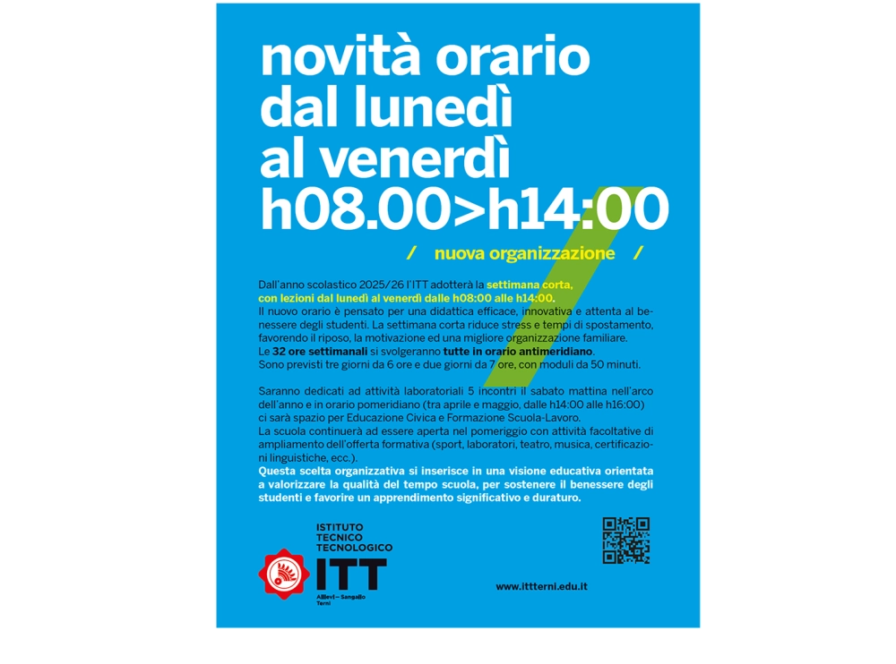 Dall’anno scolastico 2025/26 l’ITT adotterà la settimana corta,